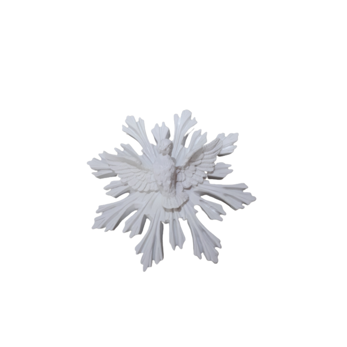 Imagem divino espirito santo em resina para decoração. Utilize em batizados, eventos religiosos ou como lembrancinha. Possui pendurador na parte de trás, podendo pendurar a imagem em porta ou parede. Feito em resina, possui detalhes em alto relevo, permitindo decoração e pintura.