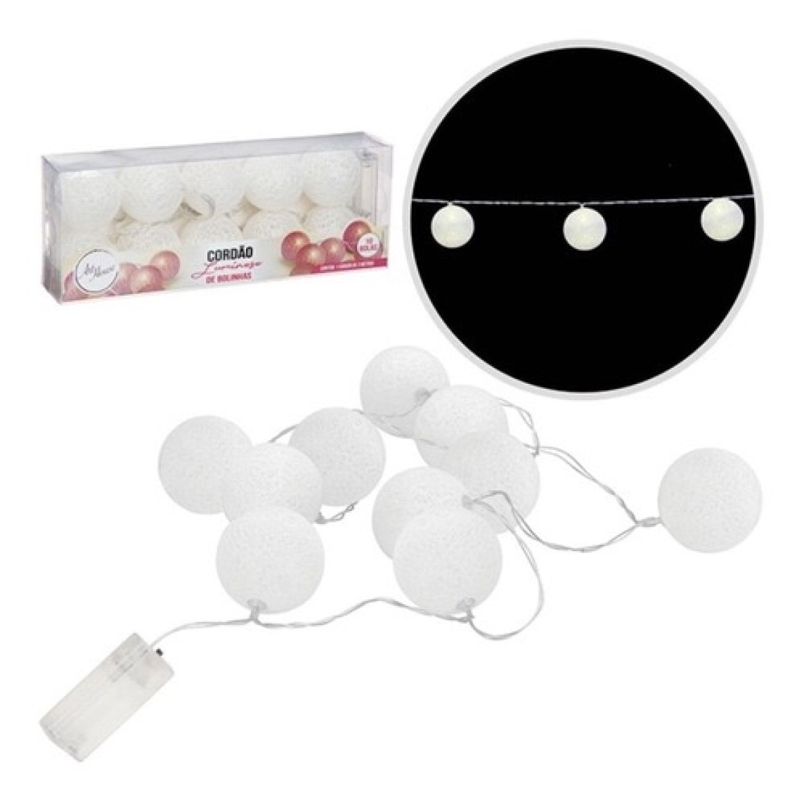 Cordão luminoso de bolinhas brancas.