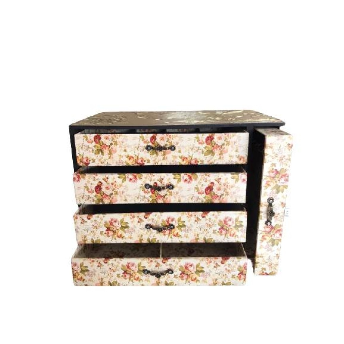 Baú de madeira com estampa de flores grande, pota jóias com gavetas.