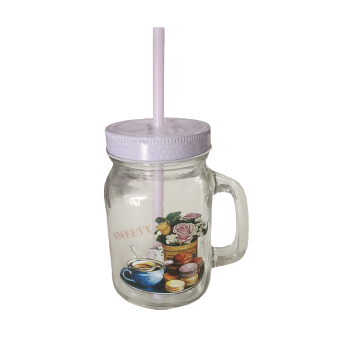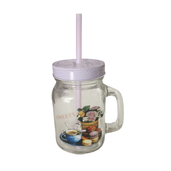 CANECA ESTAMPADA DE VIDRO COM CANUDO